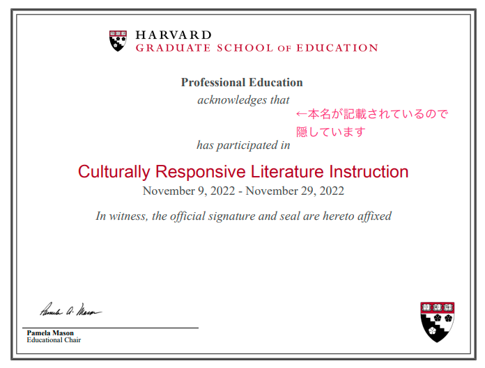例えば私はM1の11月に,ハーバード教育学大学院プロフェッショナル開発部1が主催する「多文化的な文学指導の方法(原題:Culturally Responsive Literature Instruction)」を受講し,修了書も頂きました。